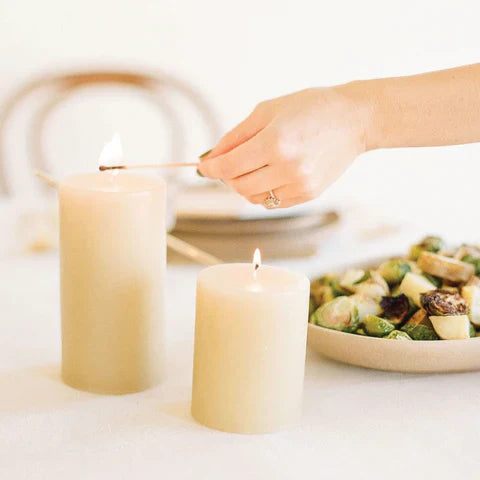 After the first burn (or possibly after you’ve “reset” the candle's memory as described above), you’ll want to make sure that the edges of your pillar candle stay strong so that they don’t spill wax. To do this, once you’ve put out the flames, gently put your hands around the top edges of the candle and push the wax inward to create a small lip. Doing this ensures that the walls don’t break down and spill wax, allowing your candle to live a longer and brighter life.