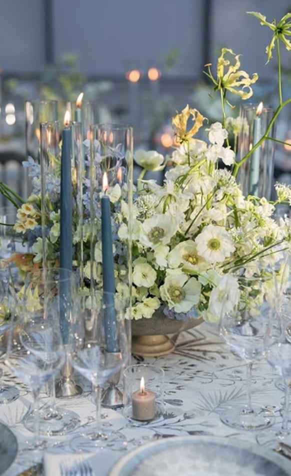 For these, you’ll want to keep to the classic colors: ivory, white, and maybe one or two black candles to add some depth. Choose either simple or ornate holders of various heights and spread them evenly across the table.