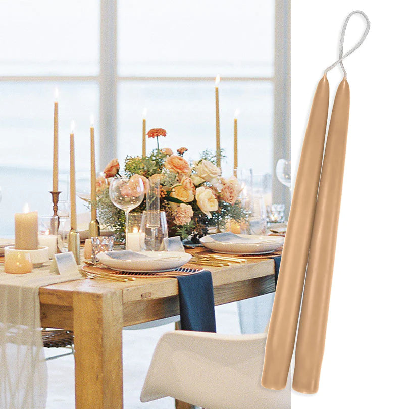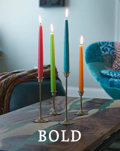A taper candle is a slender candle that gradually tapers from a wider base to a narrower top. They come in various lengths that can range from demure to dramatic (6” to upwards of 39”). Designed to fit into candlesticks and candelabras, they can be used for decorative purposes, such as adding an elegant touch to a dinner table or enhancing the atmosphere in any room. You’ll also find taper candles playing vital roles in celebrating Advent and Chanukah, as well as wedding ceremonies.